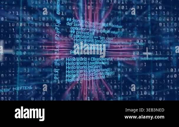 Animation of binary coding data processing over glowing computer ...