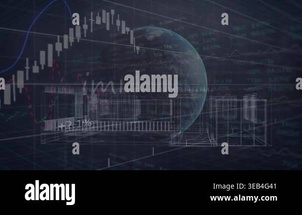 Animation of globe, binary coding and data processing over house ...