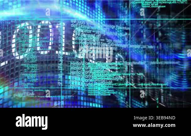 Animation of network of digital icons over binary coding data ...