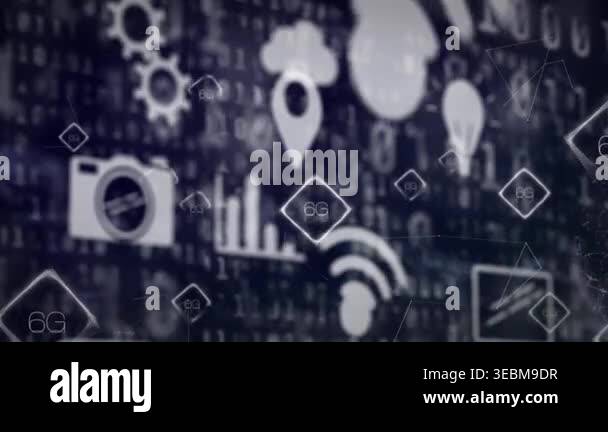Animation of tech icons over binary code and black background. Global ...