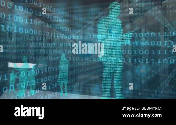 Animation of binary code moving over people silhouettes over servers ...