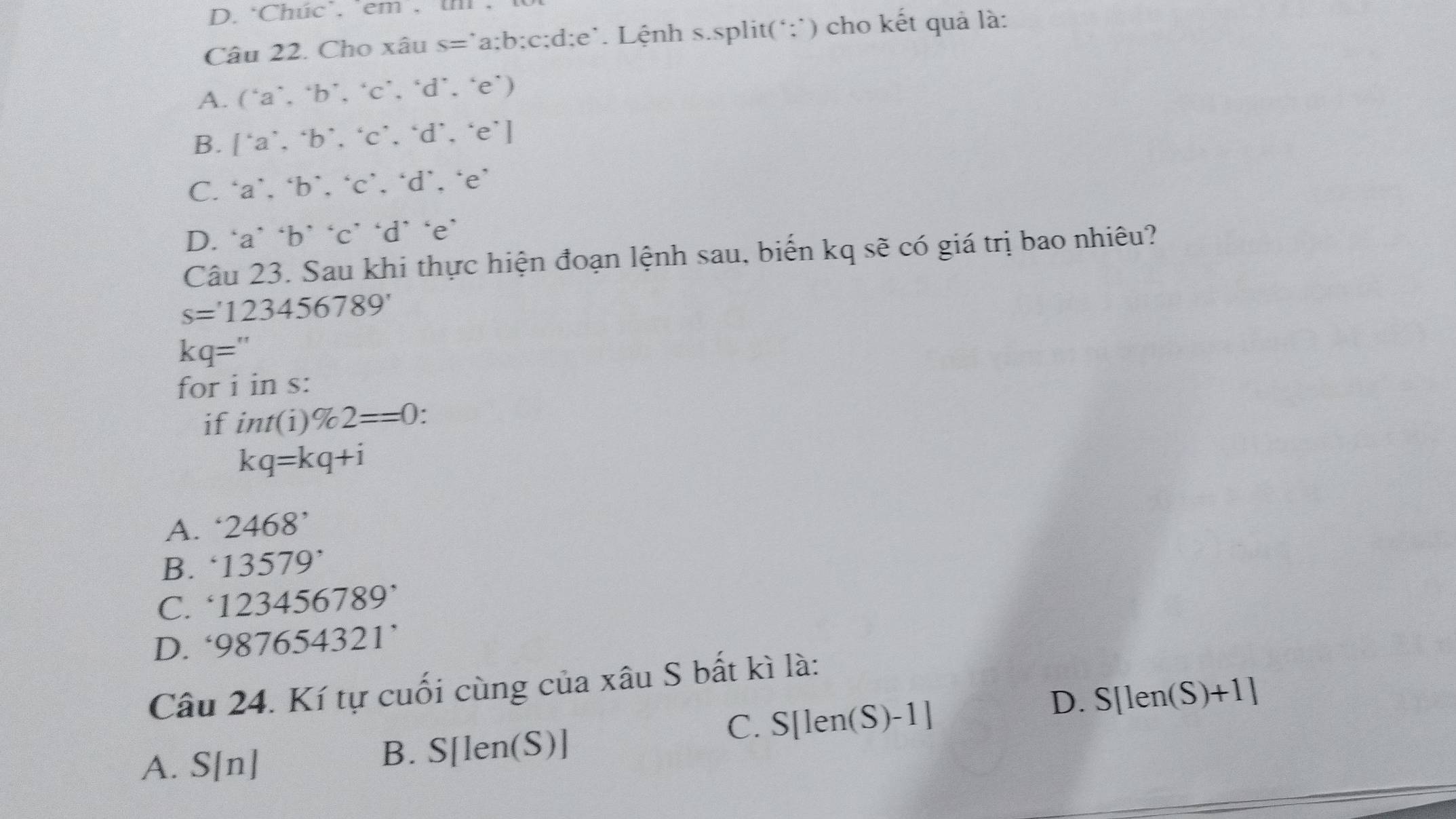 Giải quyết:‘Chúc`, `em´, thì, Câu 22. Cho xâu s=`a; b; c; d;e˙. Lệnh s ...