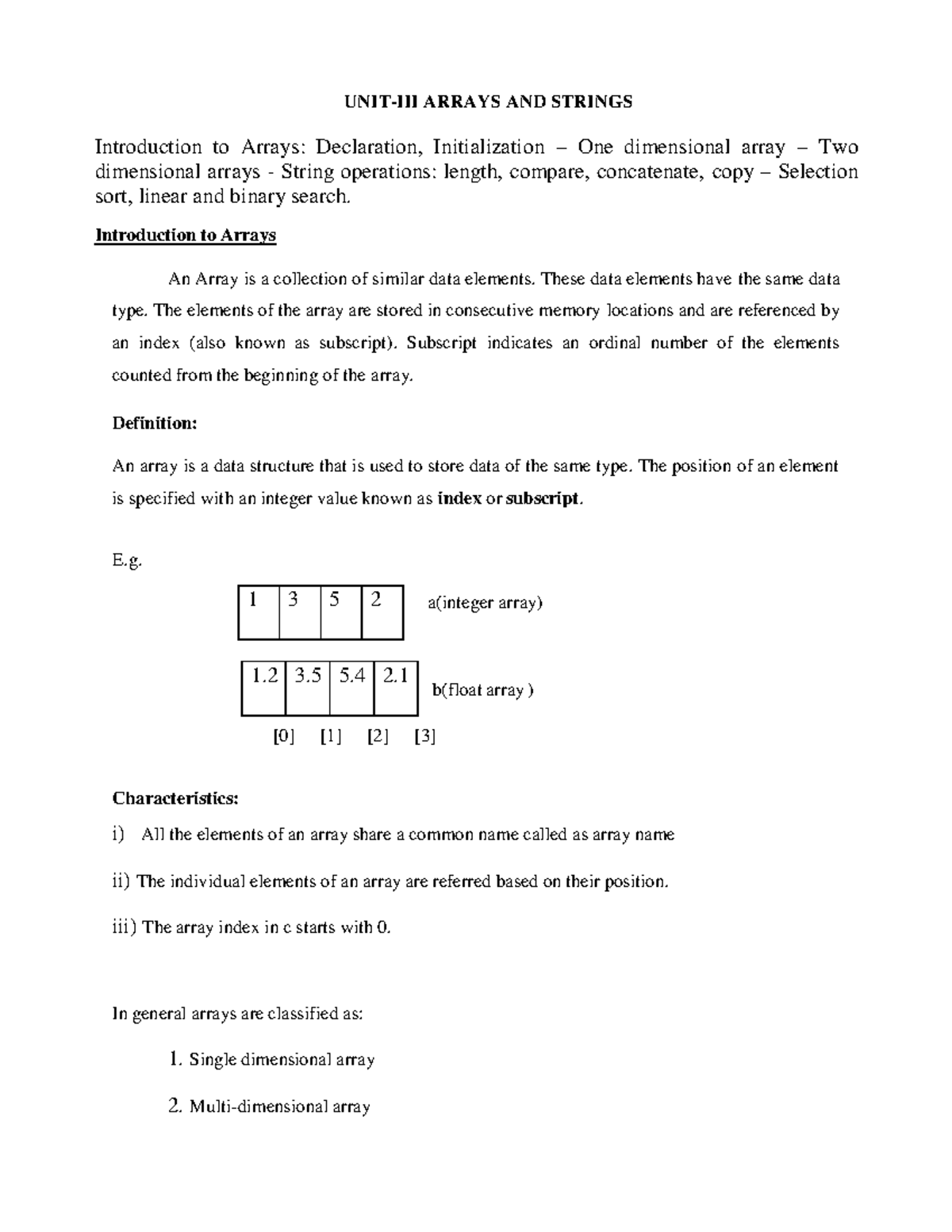C Programming: Arrays & Strings - Unit III Overview - Studocu