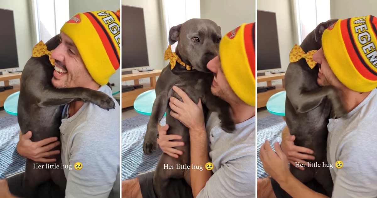 Dog is dad's forever baby the way she loves giving him little hugs