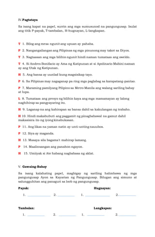 I. Buuin ang hugnayang pangungusap sa bawat bilang. Punan ang patlang ...