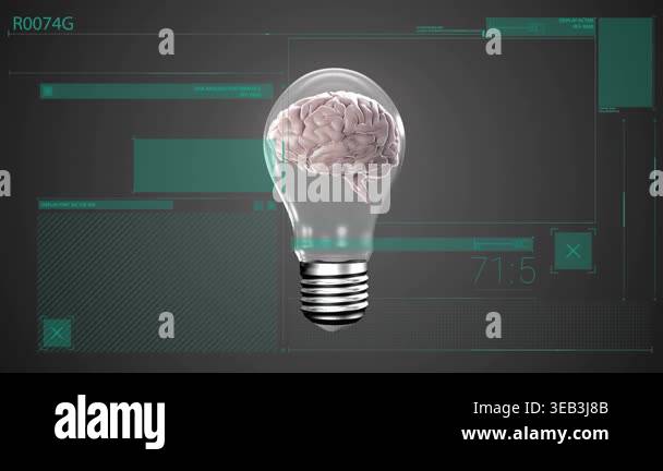 Animation of data processing over lightbulb with human brain. Global ...