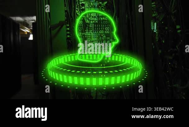 Binary code and human head hologram animation over server room ...