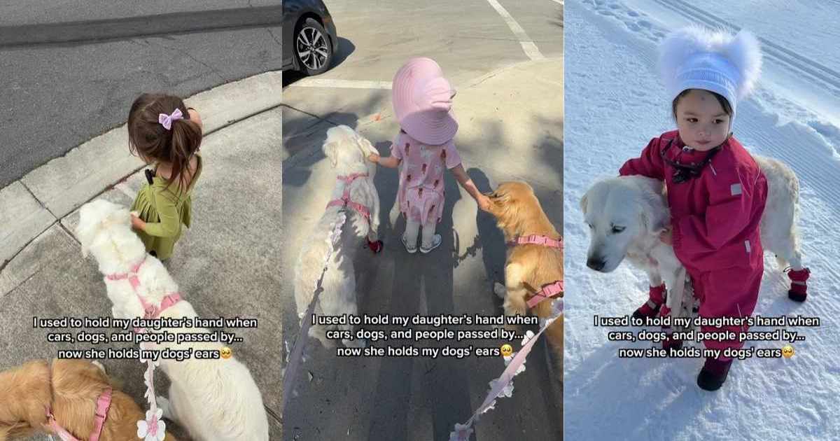 Little girl holds golden retrievers' ears when someone passes by for a ...