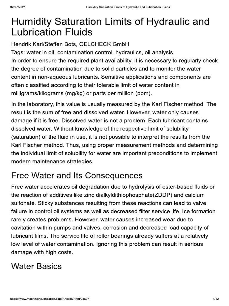 Humidity Saturation Limits of Hydraulic and Lubrication Fluids