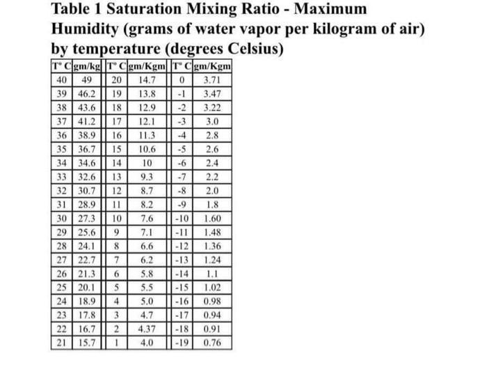 Table 1 Saturation Mixing Ratio - Maximum Humidity | Chegg.com