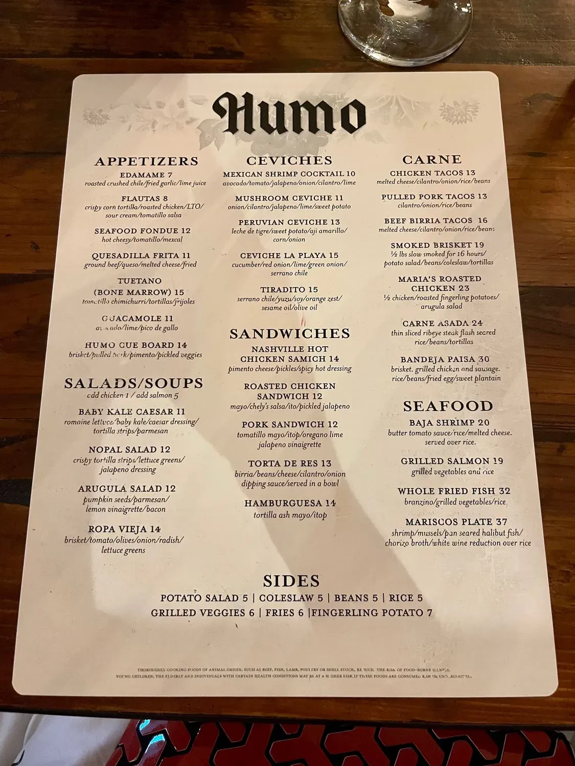 Menu at Humo restaurant, Tyler