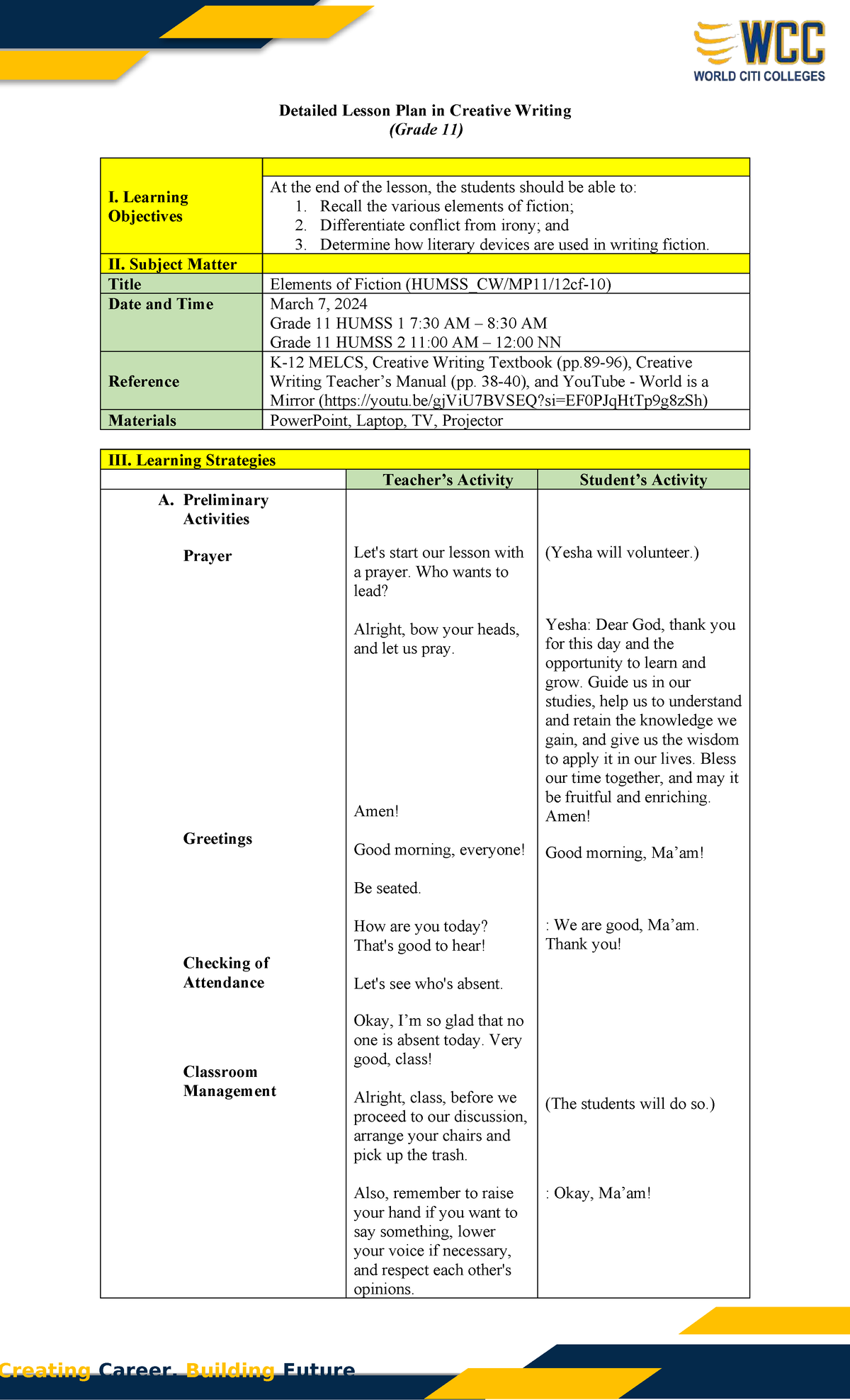 Detailed Lesson Plan: Elements of Fiction (Grade 11 HUMSS) - Studocu
