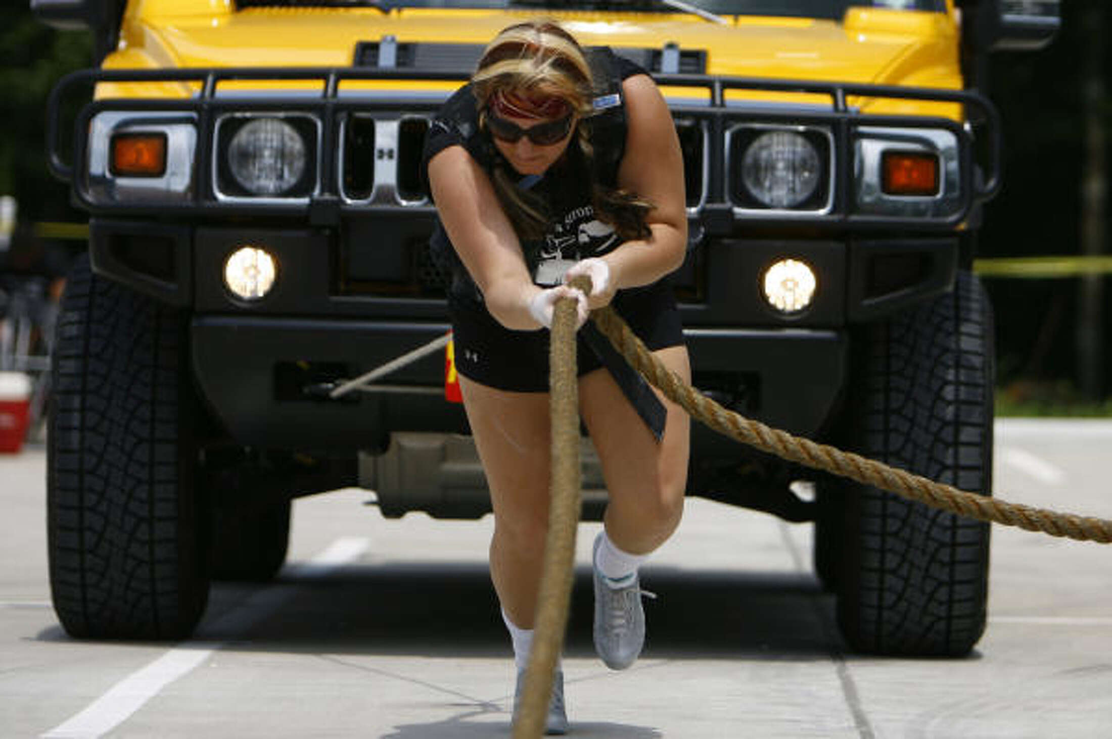 It takes a strong man -- or woman -- to pull a Humvee