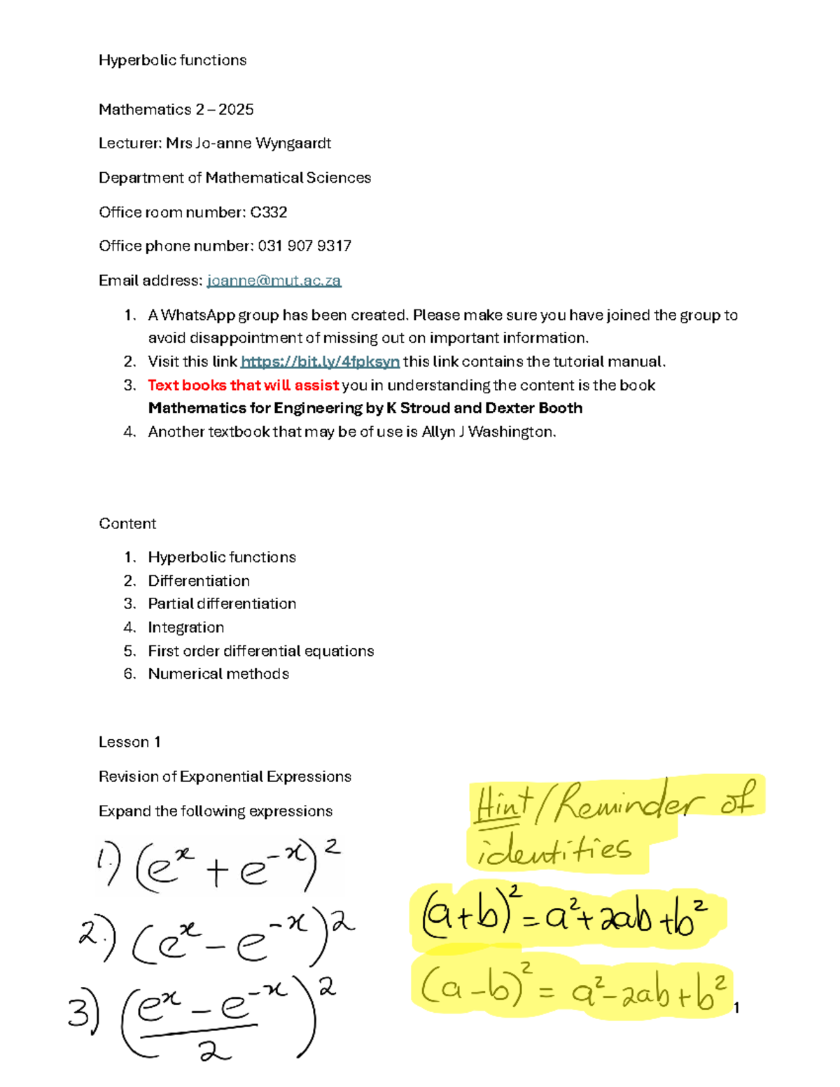 Hyperbolic Functions Week 1 - Math 2 (2025) Lecture Notes - Studocu