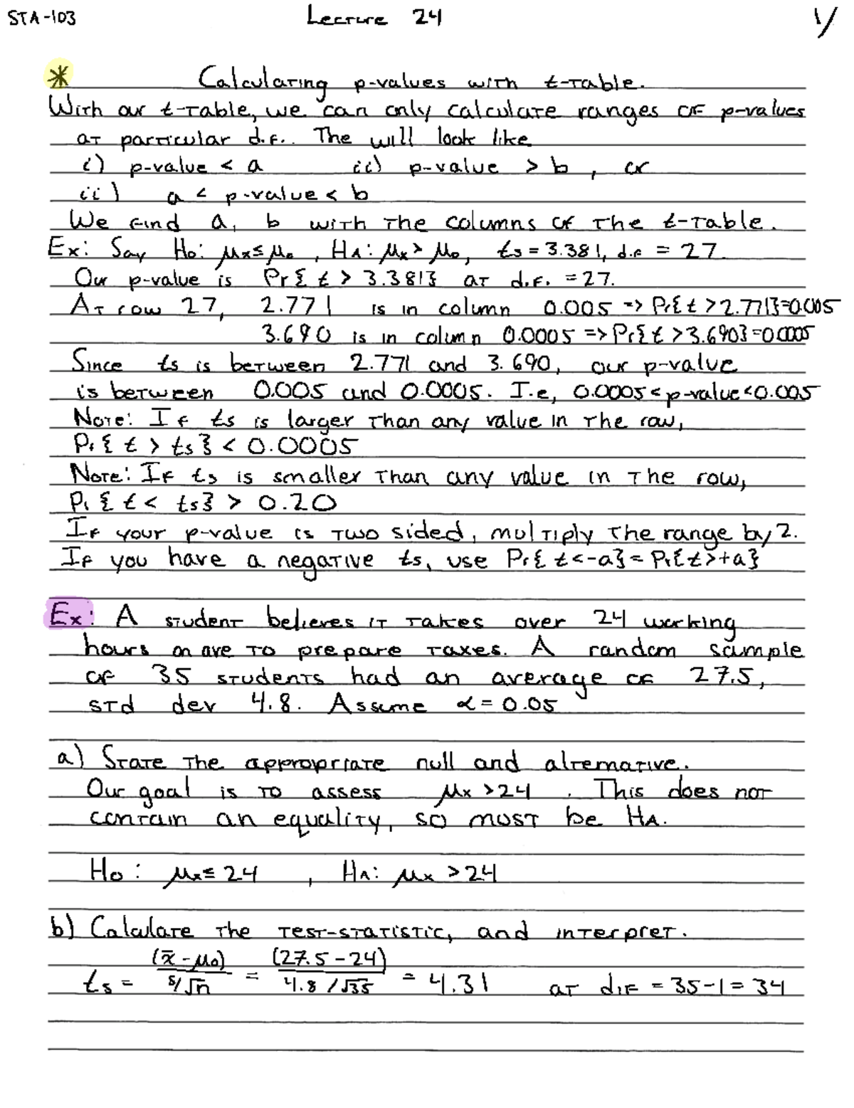 STA 103 Examples of Hypothesis Tests - Lecture 24 TA 103 With ...