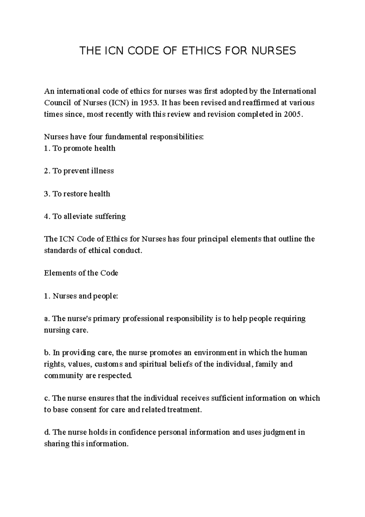 SOLUTION: The icn code of ethics for nurses - Studypool