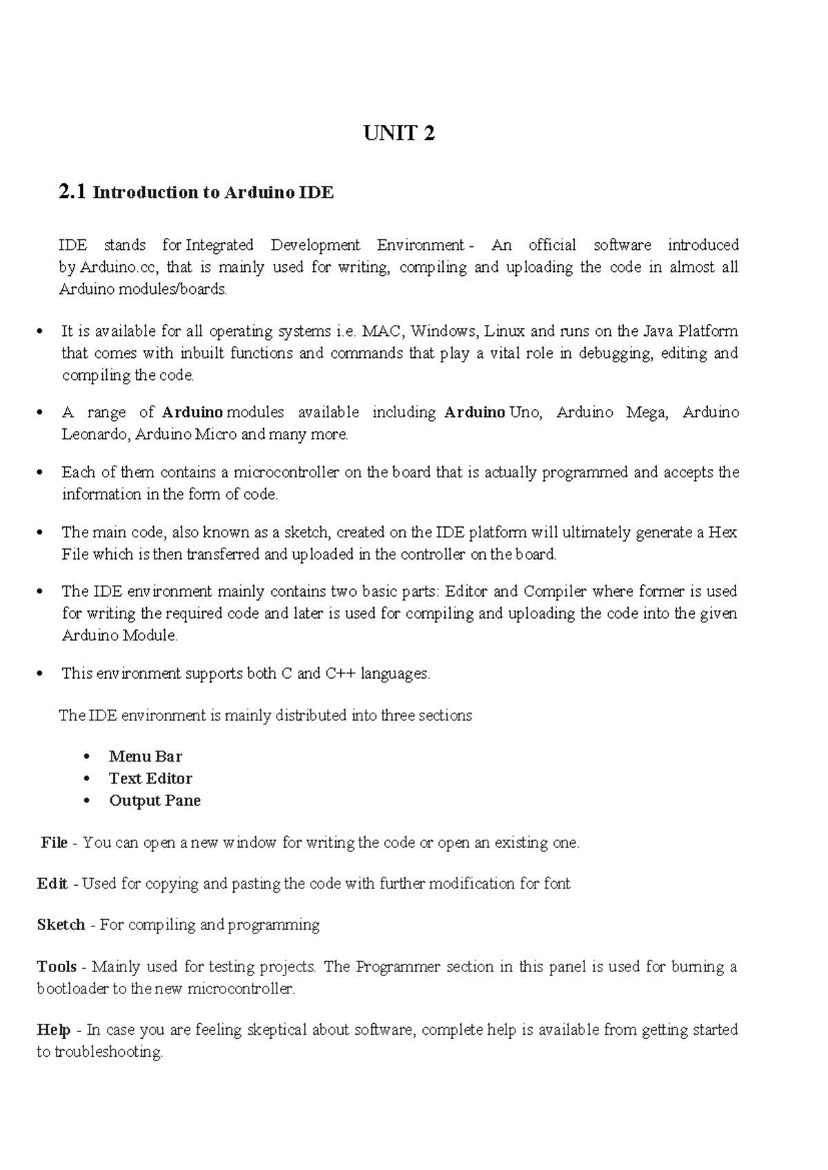 Unit 2: Introduction to Arduino IDE, Sensors & Actuators - Studocu
