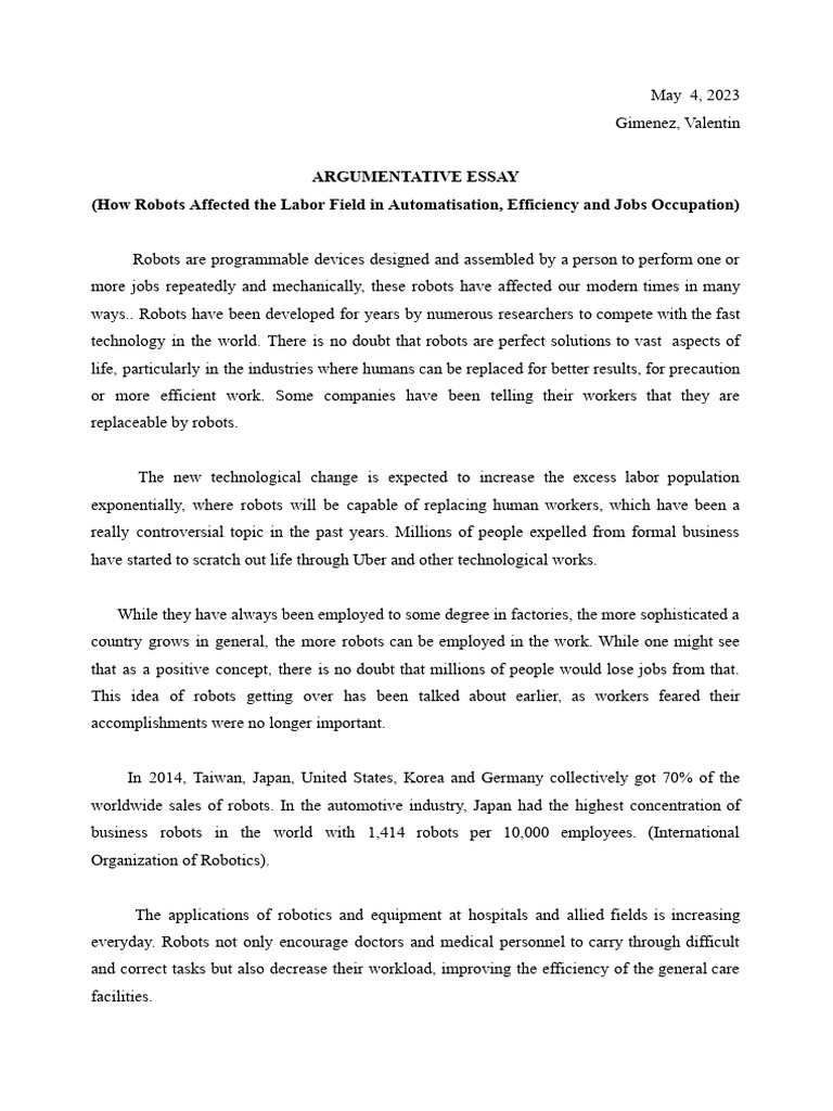 Argumentative Essay (ILAC) Gimenez, Valentin | PDF | Robot | Robotics