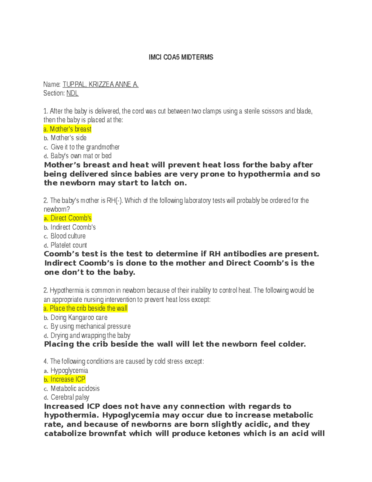 IMCI COA5 MIDTERM EXAM REVIEW NOTES FOR NDL SECTION - Studocu