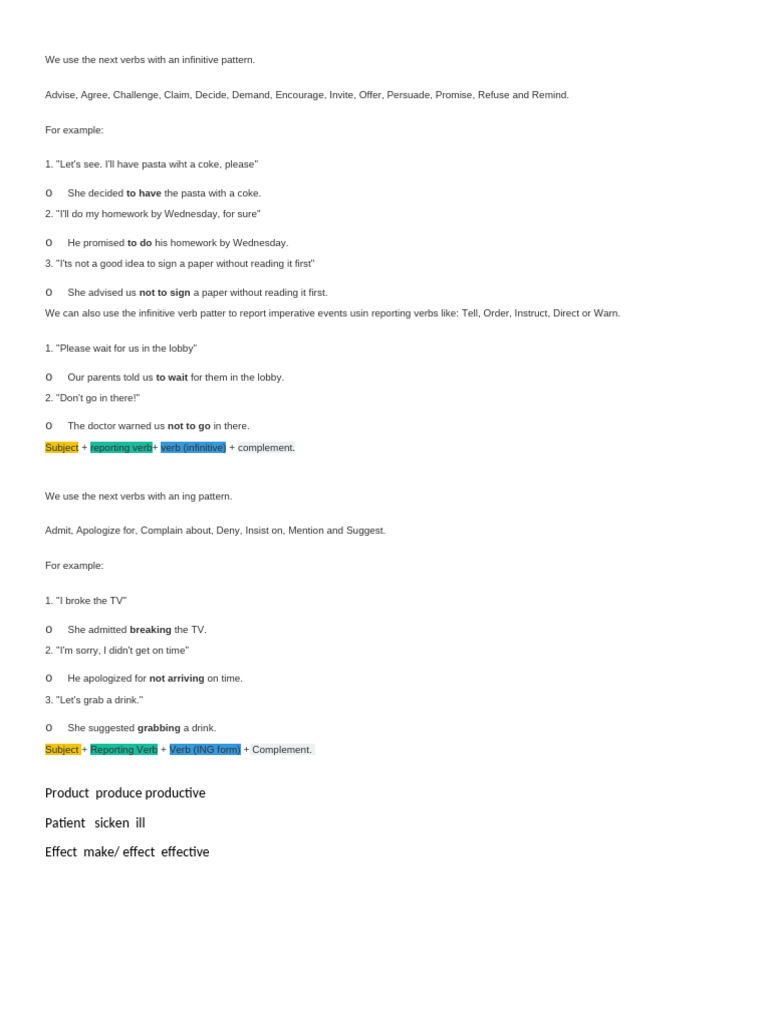 Verb Patterns - verb + -ing, verb + to infinitive, verb + object + to ...