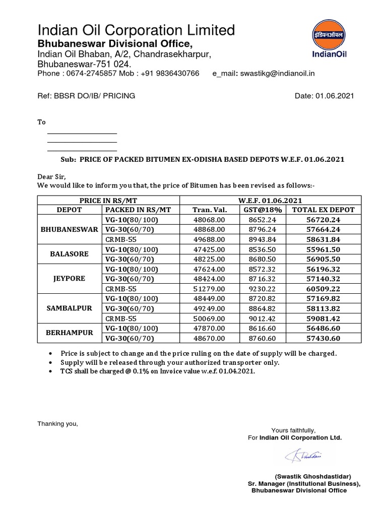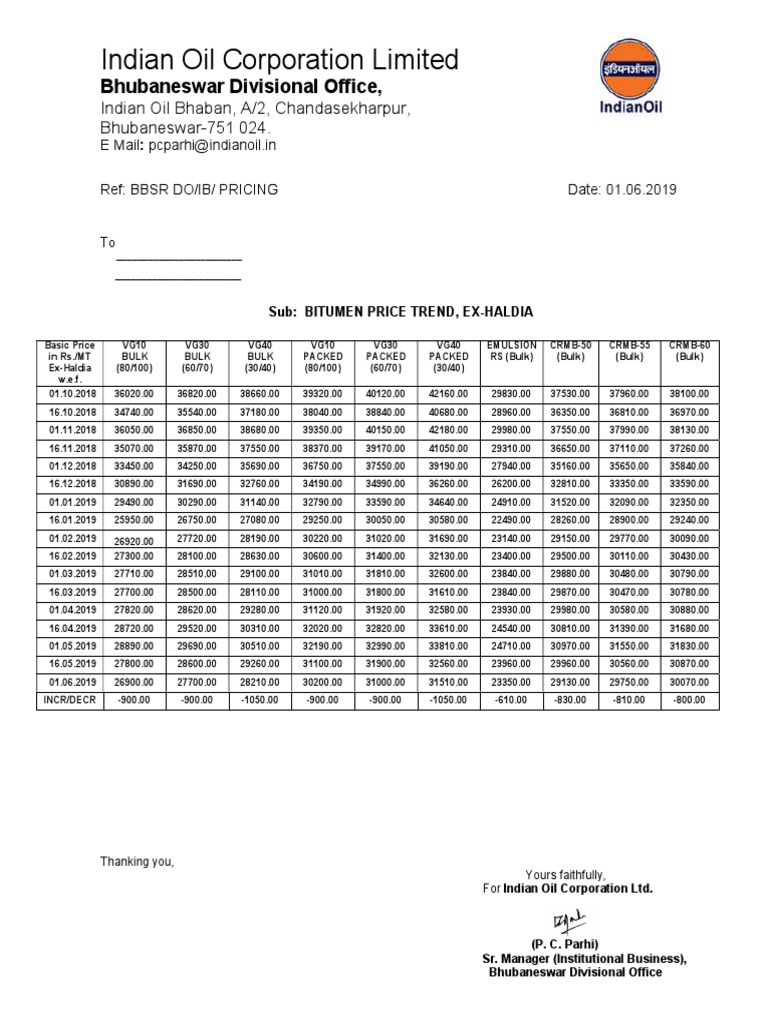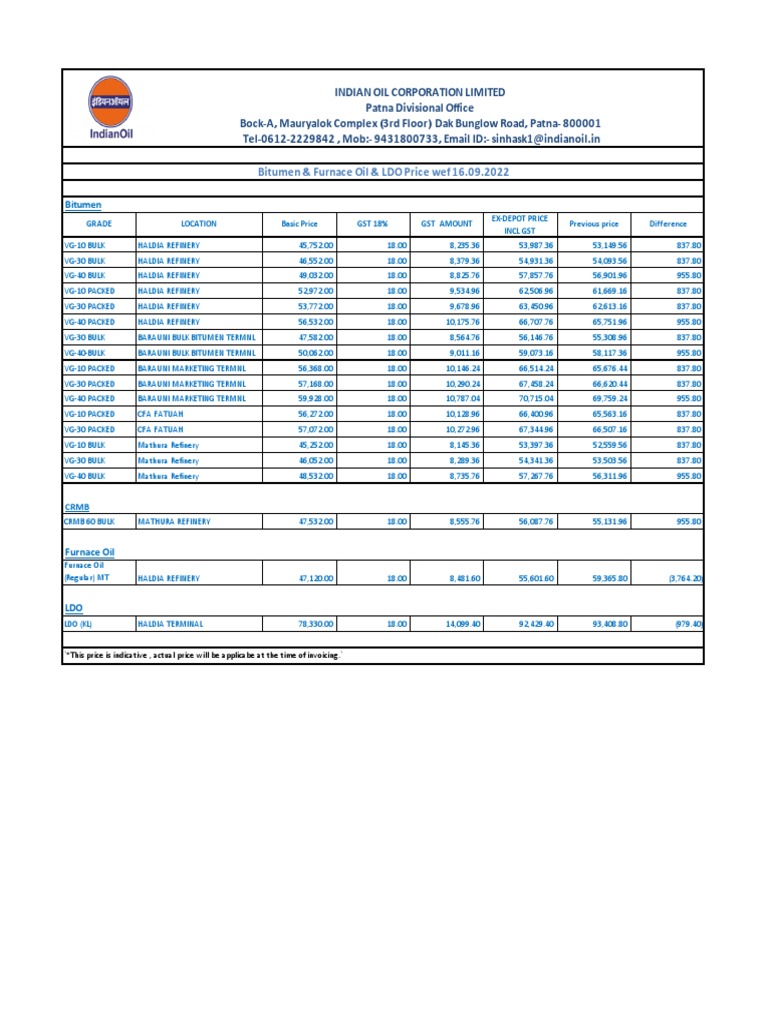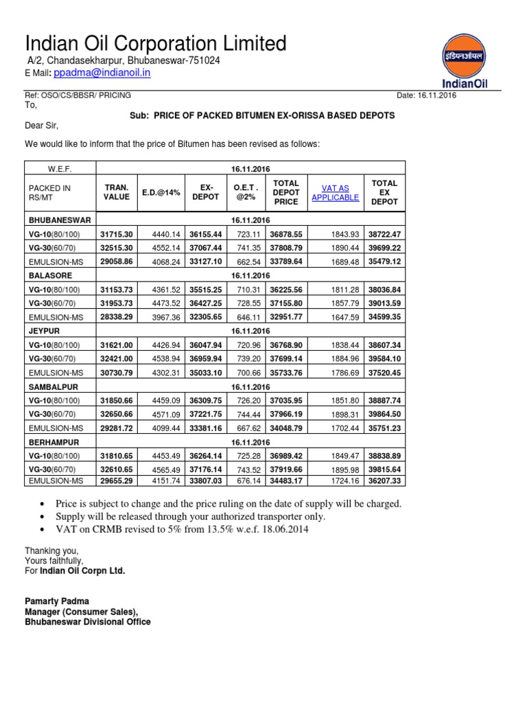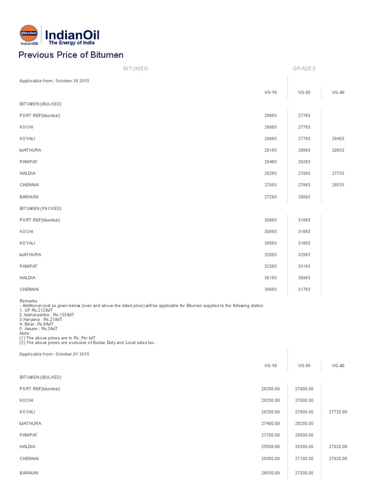 Indian Oil Corporation - Bitumen Prices | PDF | Excise | Taxation