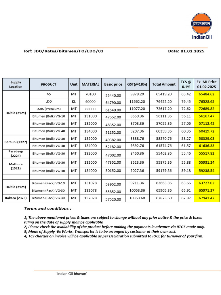 IOCL VG30 Bitumen Prices March 2025 | PDF