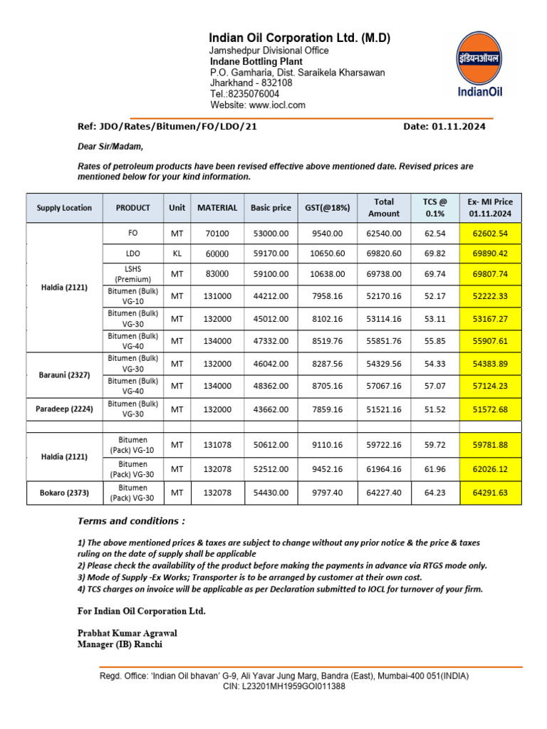 IOCL Bitumen Price List November 2024 | PDF | Taxes | Fossil Fuels
