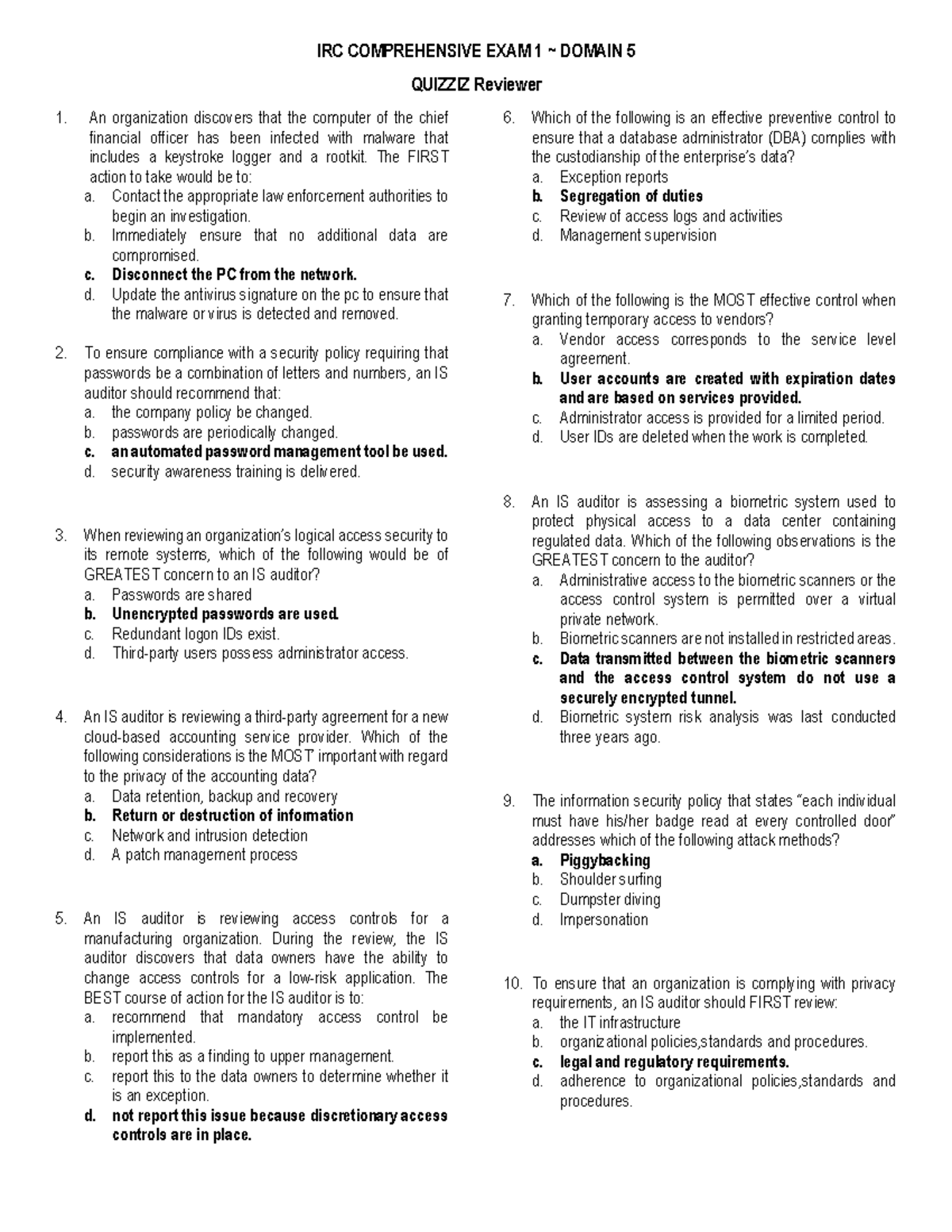 Domain 5 Practice Questions - IRC COMPREHENSIVE EXAM 1 ~ DOMAIN 5 ...