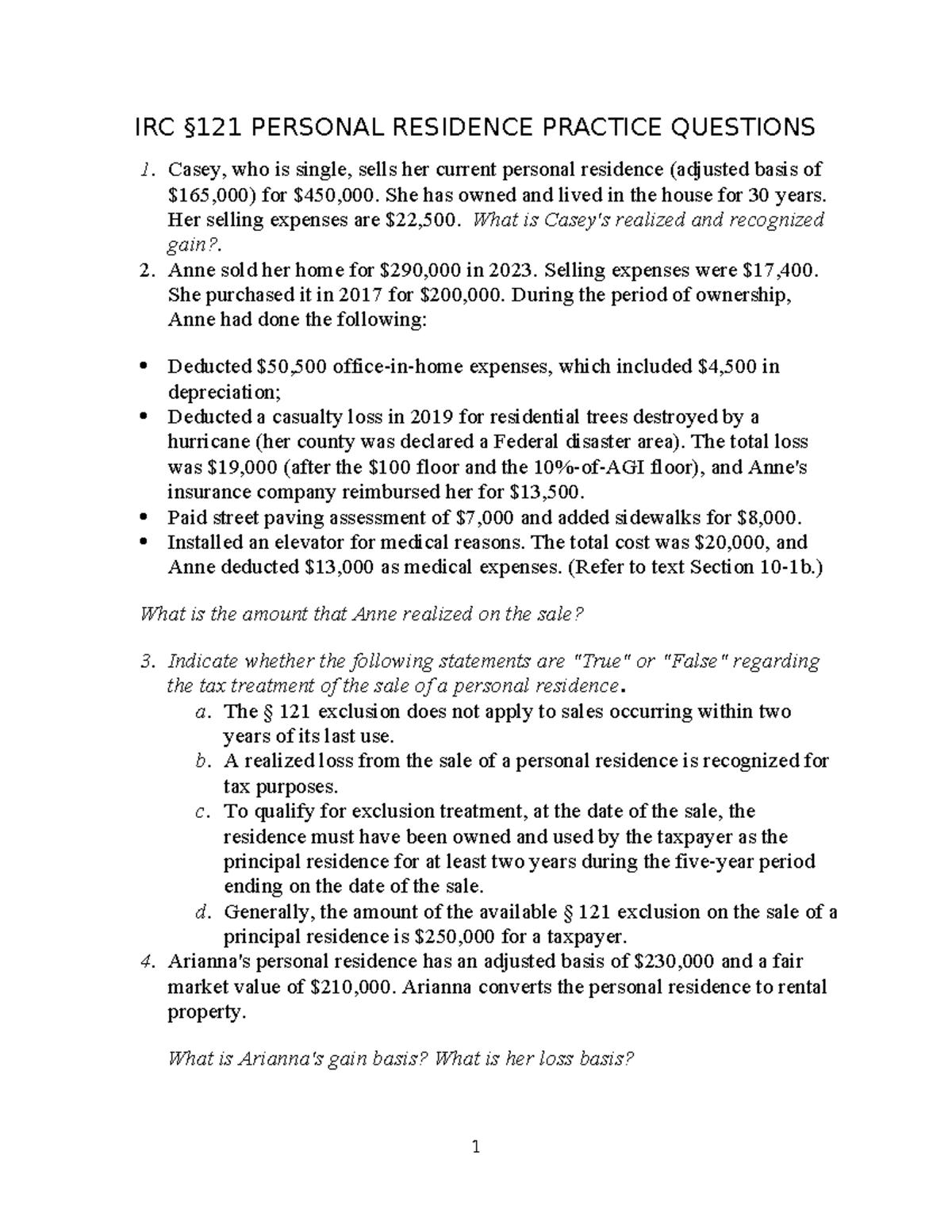 IRC §121 Personal Residence Practice Questions and Scenarios - Studocu
