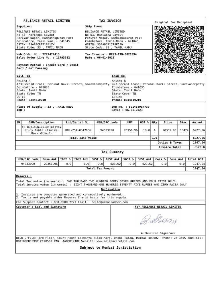 Reliance Retail Tax Invoice RR23-ITN-0021394 | PDF