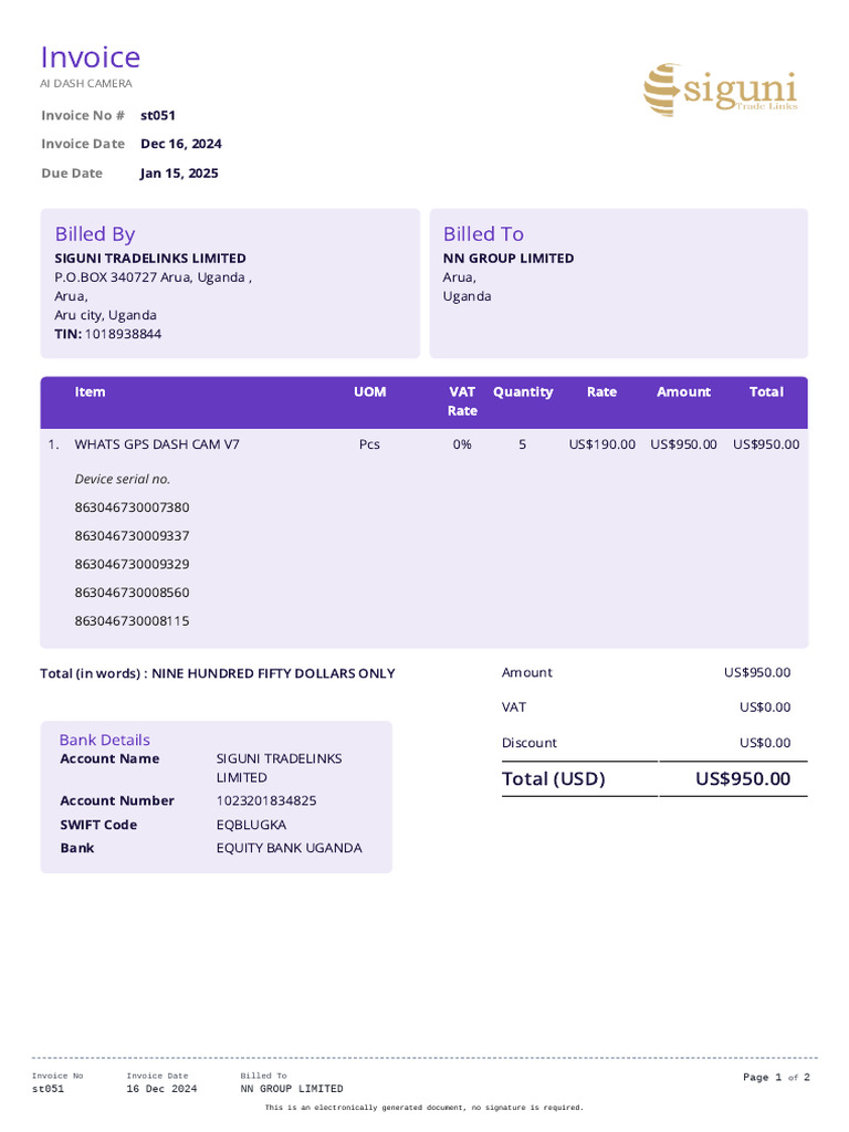 Invoice st051 Siguni Tradelinks Limited NN Group Limited | PDF | Invoice
