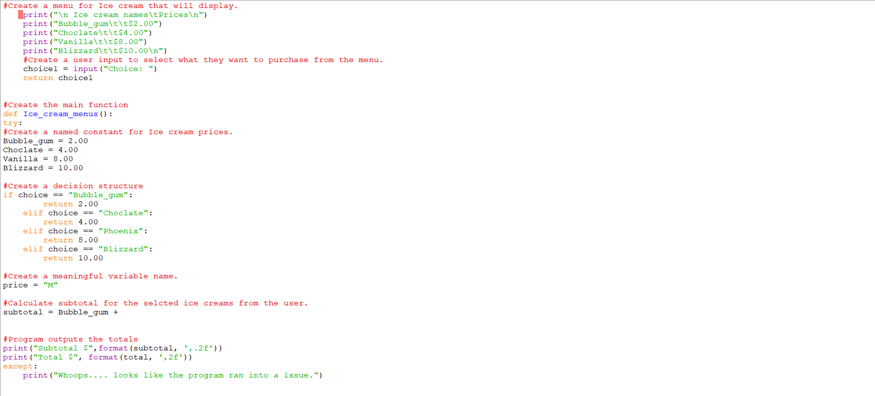 Python Programming Ice Cream Project Arrays Fixed Loops Text Based Coding