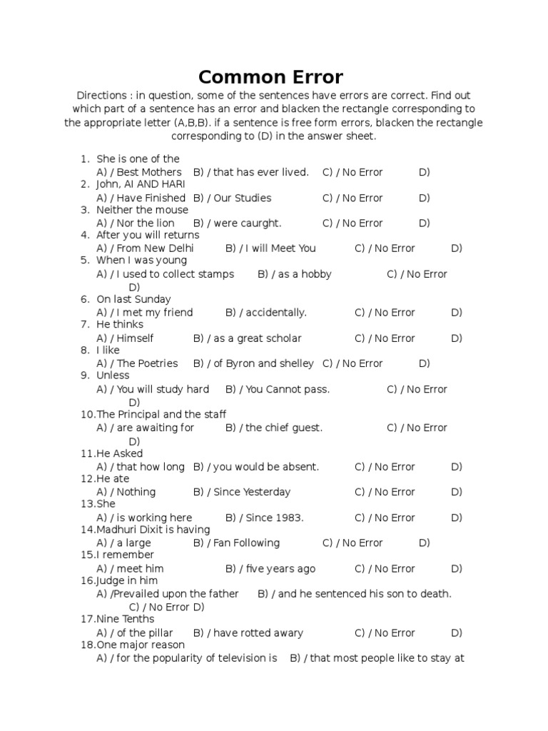 Identify the Errors - English Questions and Answers Quiz Online Test ...