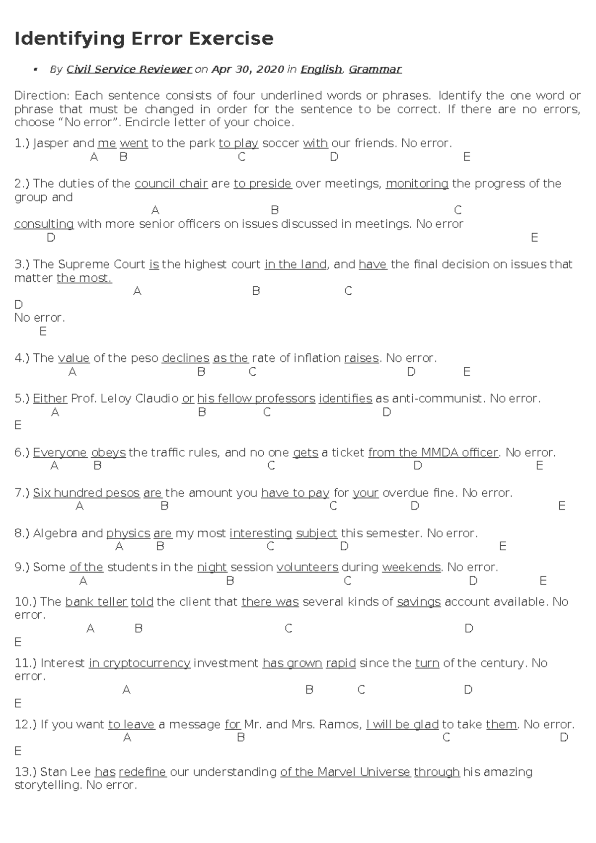Error Identification - Extra Practice Exercises. Decide Which Part of ...
