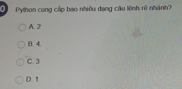 Giải quyết:Python cung cấp bao nhiêu dạng câu lệnh rẽ nhánh? A. 2 B. 4 ...