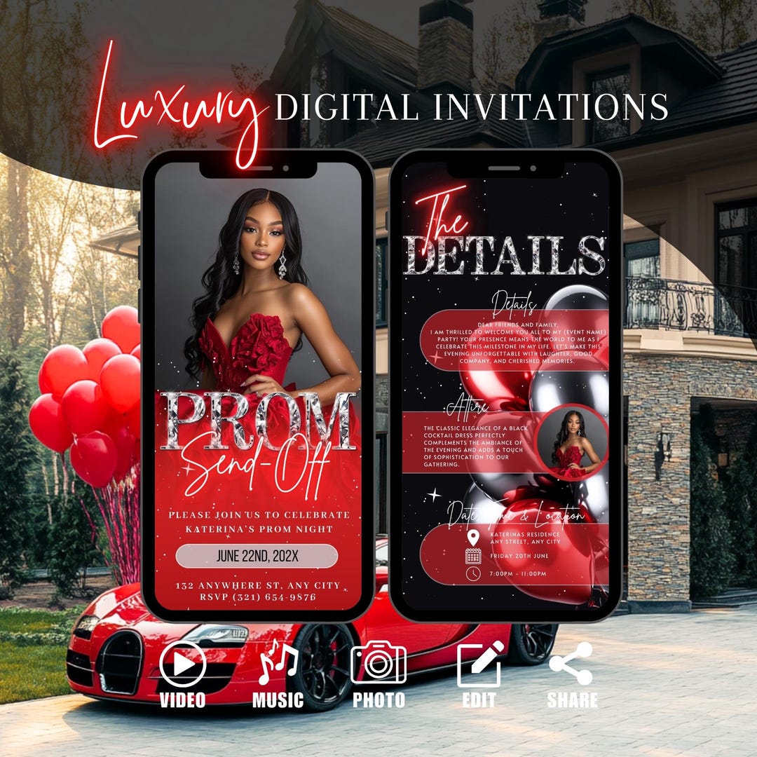 Digital Red Prom Send off Invitation, Glam Prom Party Invite, Animated ...