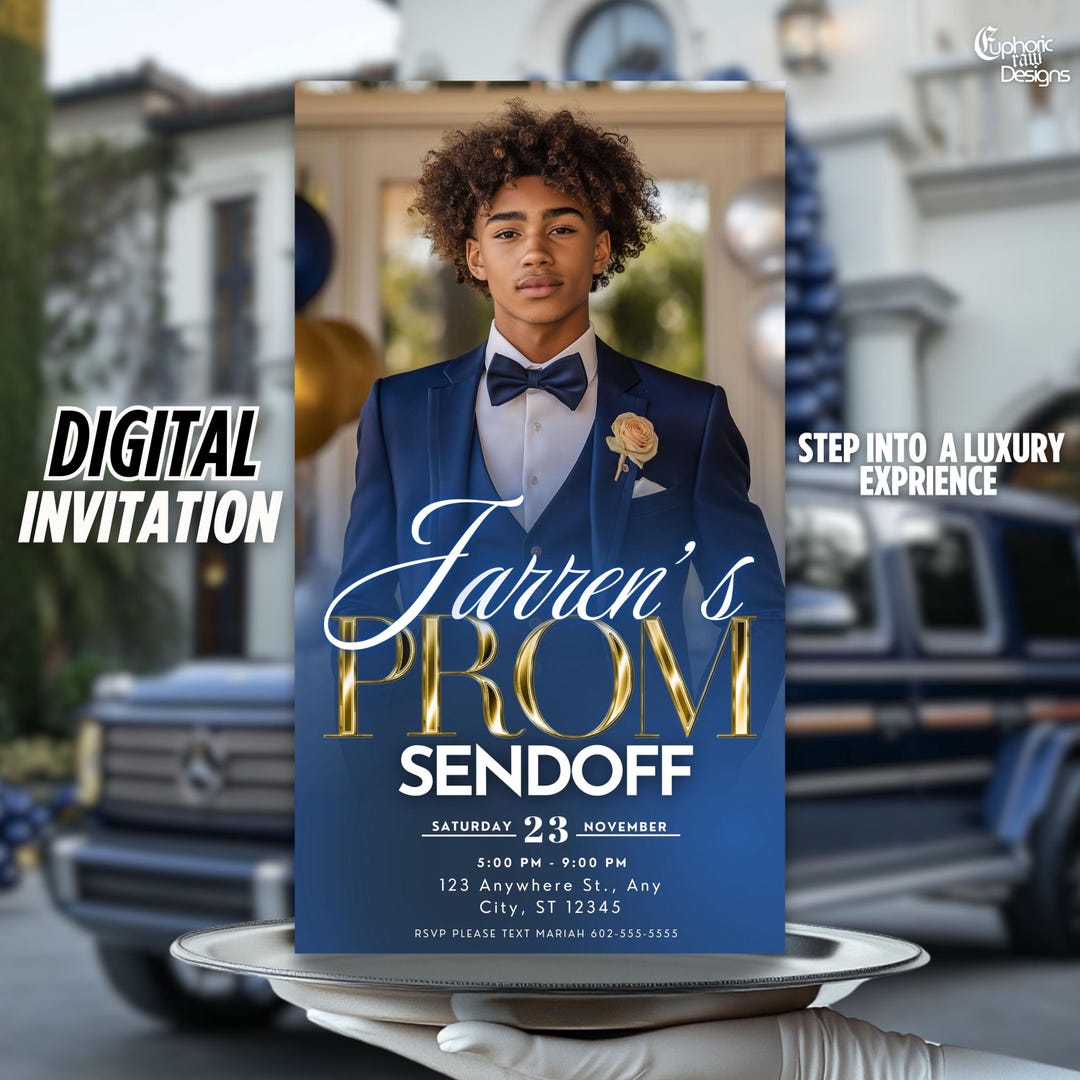 Prom Send off Digital Invitation, Blue Gold Boys Editable Flyer ...