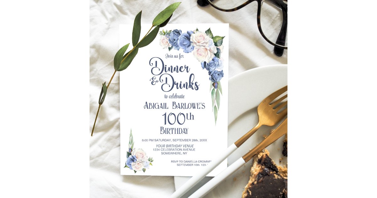 Blue White Floral Dinner and Drinks 100th Birthday Invitation | Zazzle