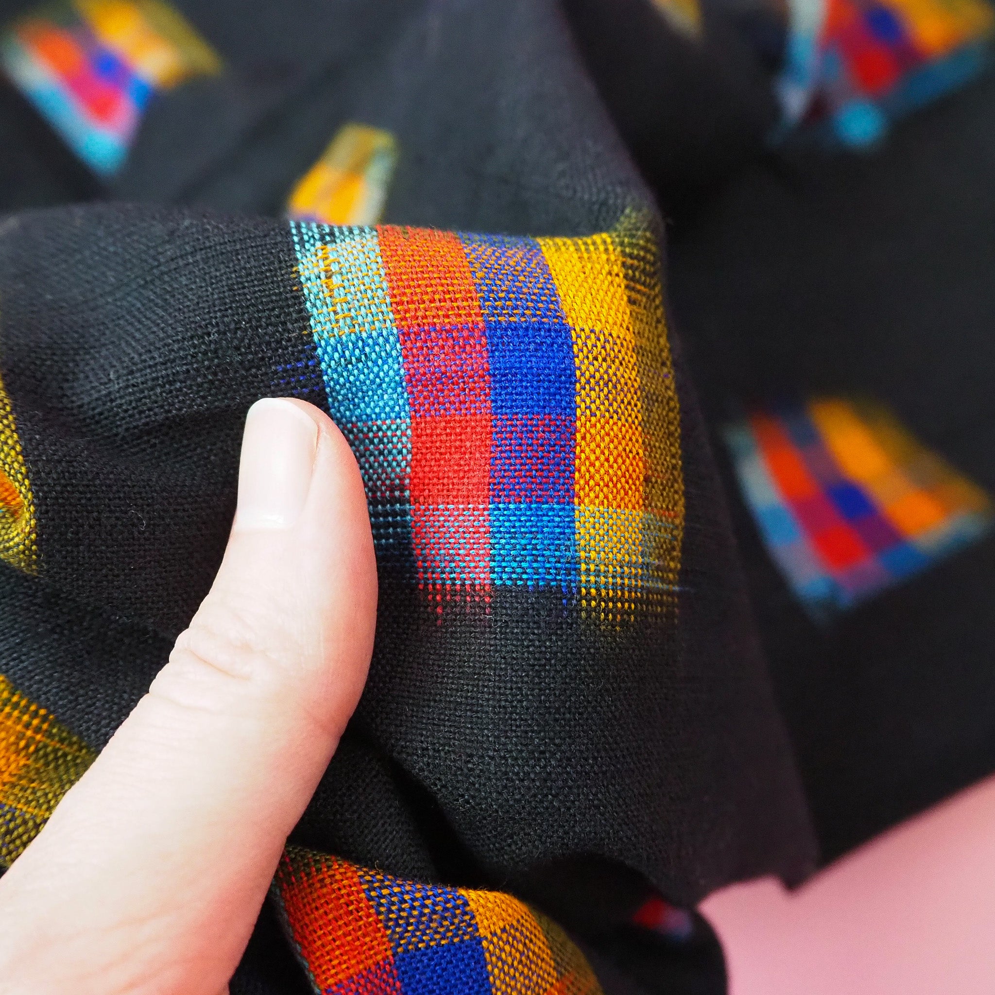 Rainbow Threads & Black Ikat Guatemalan Handwoven Cotton Fabric ...