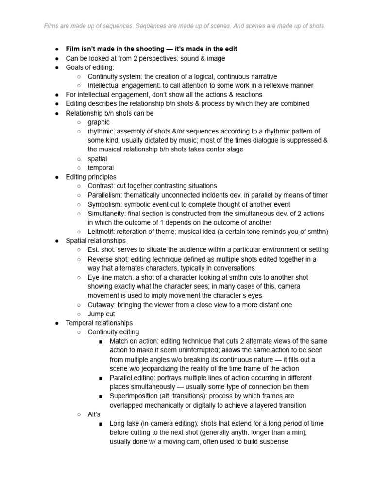Editing- Intro to Film - Notes - Editing o Unobtrusive o Joins shots ...