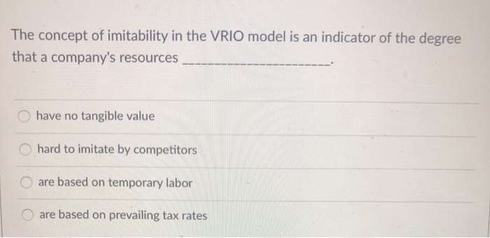 Solved The concept of imitability in the VRIO model is an | Chegg.com