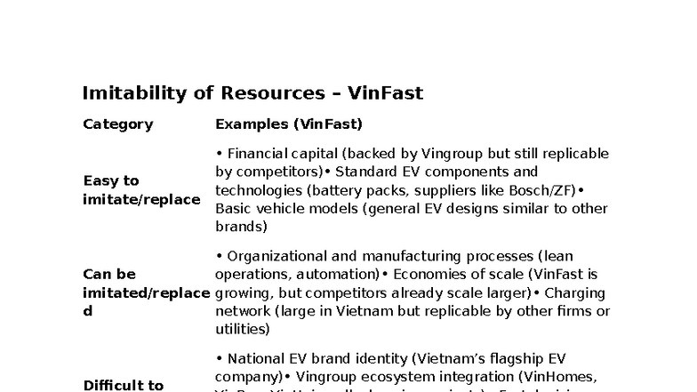 Imitability of Resources in VinFast: Category Examples Analysis - Studocu