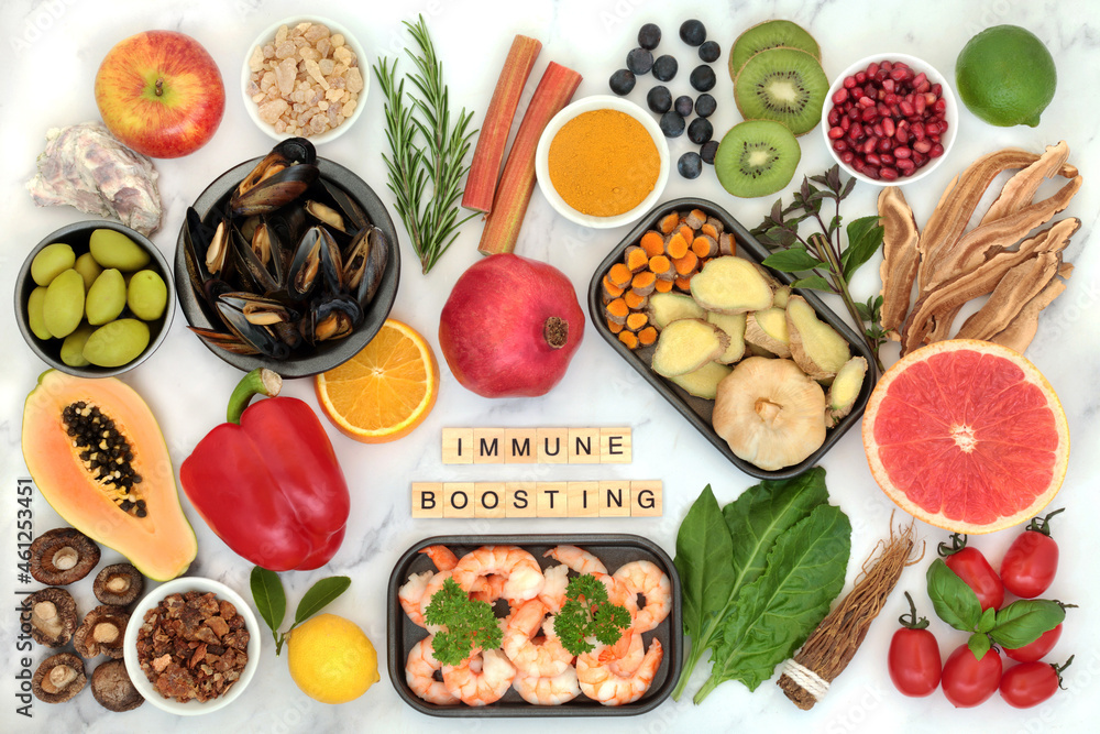 Immune system boosting health food with title, seafood, vegetables ...