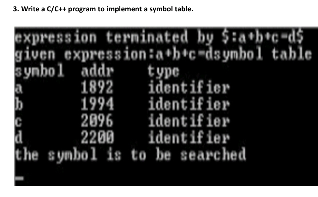 Solved 3. Write a C/C++ program to implement a symbol table. | Chegg.com