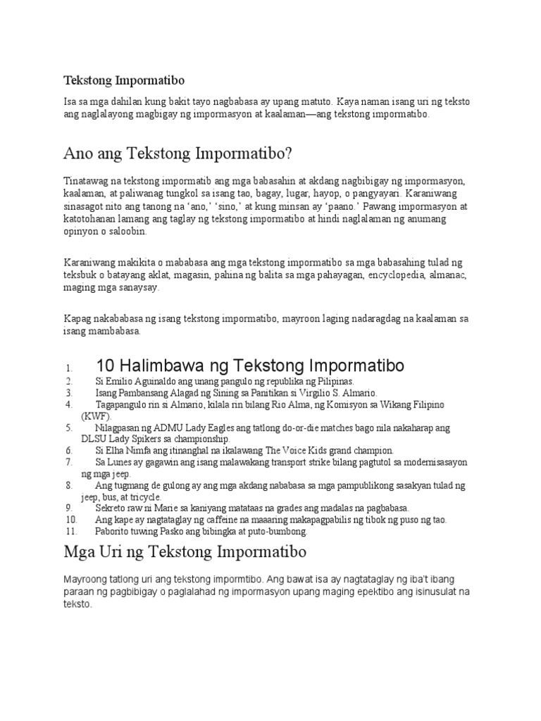 Halimbawa Ng Tekstong Impormatibo Pdf - tekstongayon
