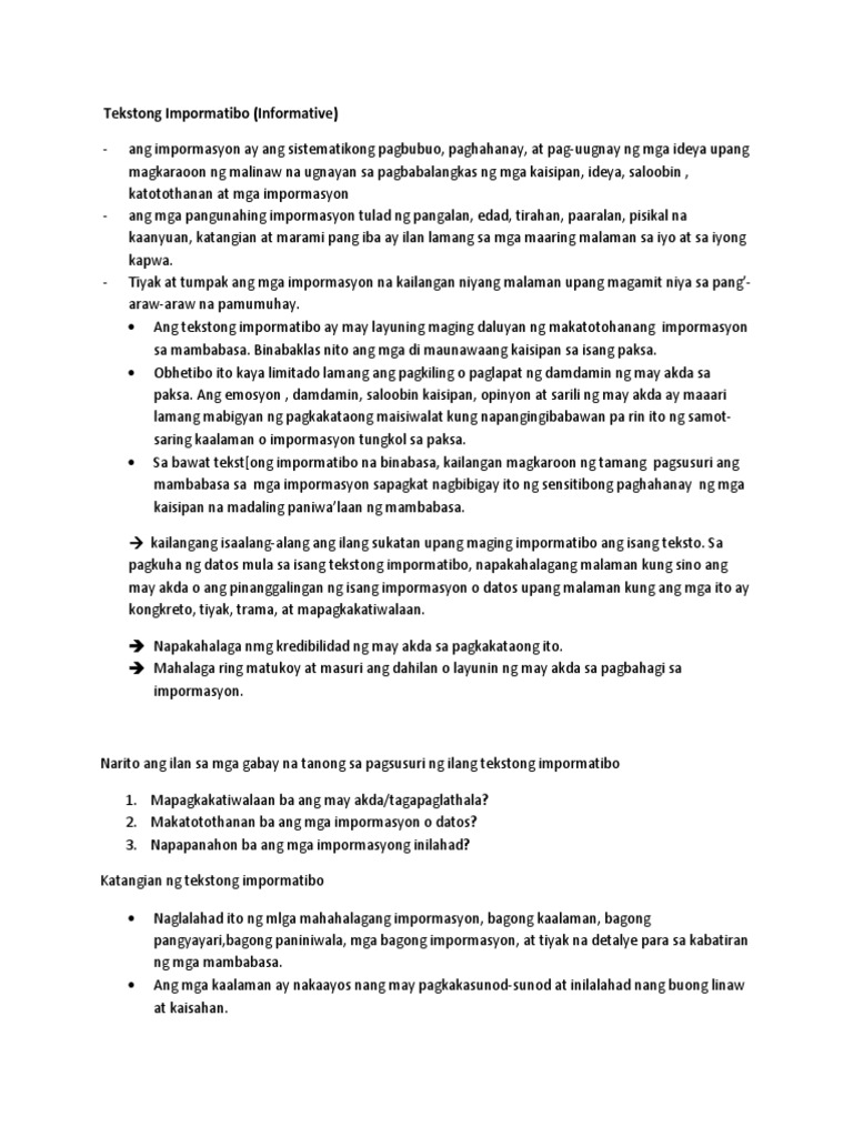 Lecture Notes Para sa Tekstong Impormatibo | PPTX
