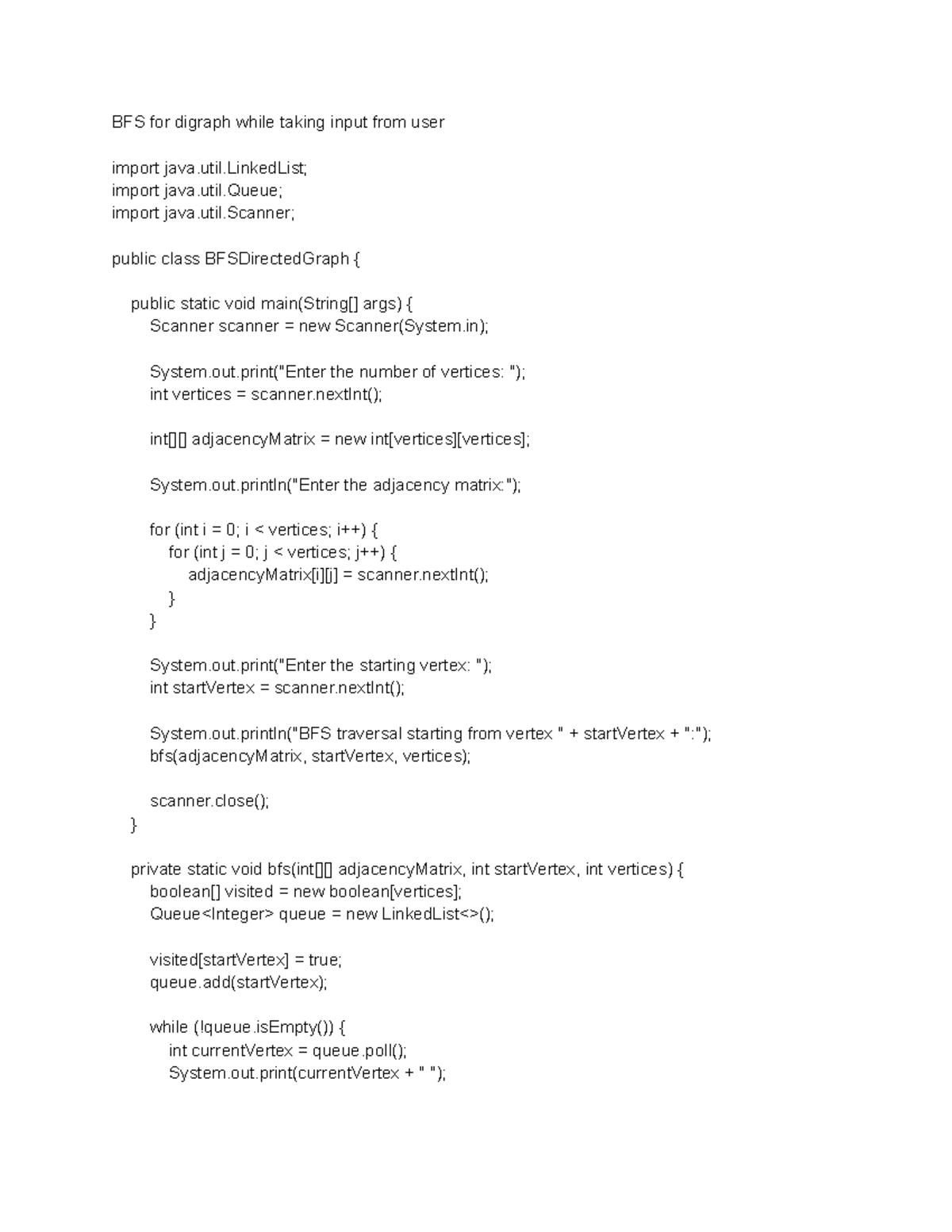 BFS for digraph while taking input from user - util; import java.util ...