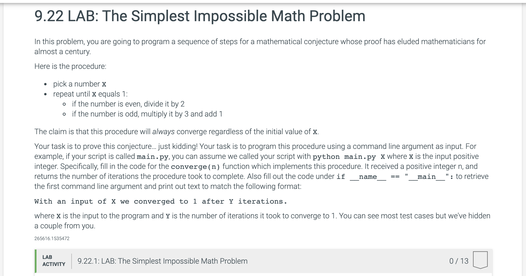 Solved 9.22 LAB: The Simplest Impossible Math Problem In | Chegg.com