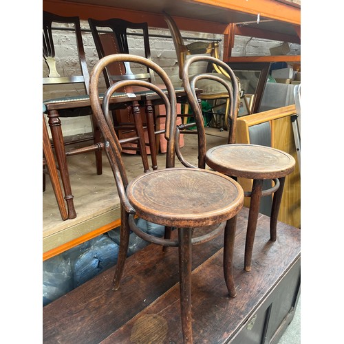 Pair of bentwood bistro chairs with scalloped shell impressed seats.