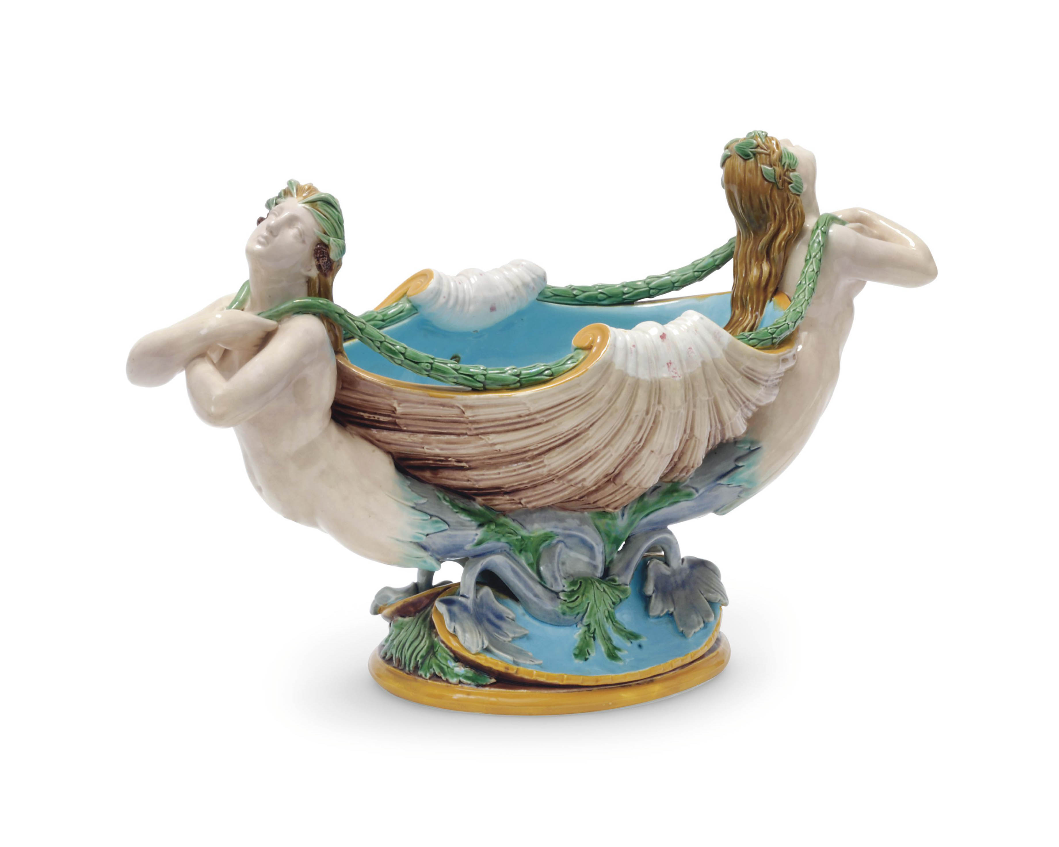 20th Century Majolica Dolphin and shell comport in the style of Minton ...